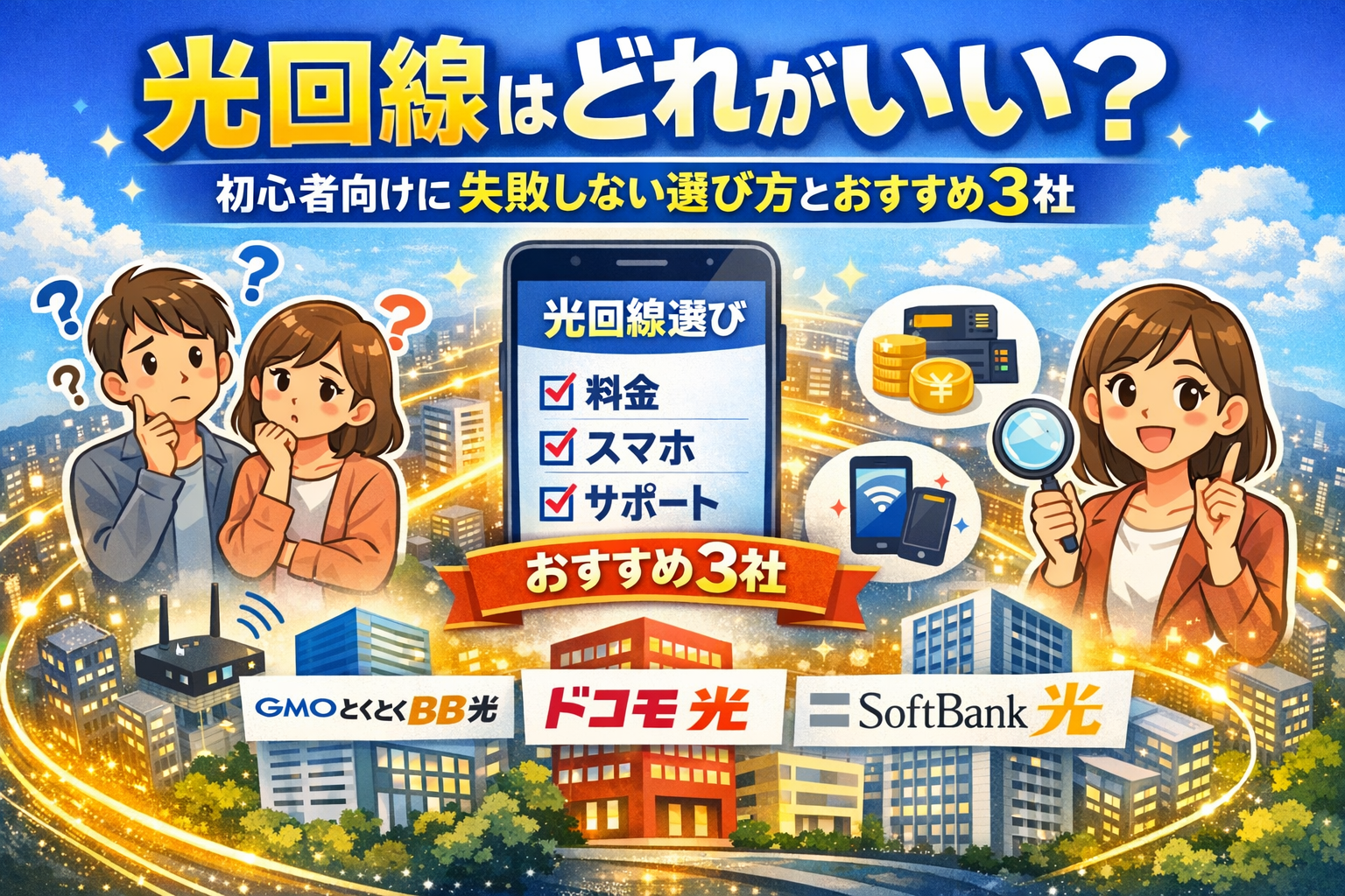 光回線の比較・選び方光回線はどれがいいか迷う初心者向けの選び方イメージ 光回線はどれがいい?と迷う初心者向けに、失敗しない選び方を解説。料金の見方・スマホ割・サポートを基準に、GMOとくとくBB光/ドコモ光/ソフトバンク光の向き不向きを整理。 2026.02.03光回線の基礎知識光回線の比較・選び方