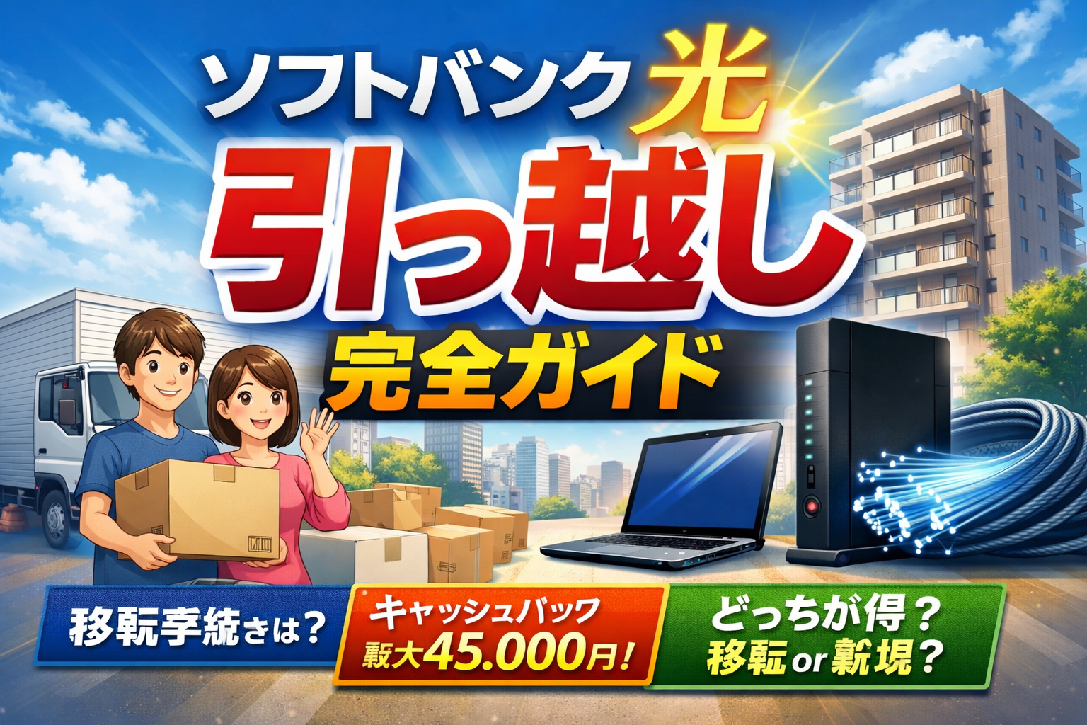 光回線 × 引越し【2026年版】ソフトバンク光の引っ越し手続き完全ガイド|移転・継続・解約どれが得? ソフトバンク光の引っ越し手続きは、移転・継続・解約で損得が変わります。本記事では手続きの流れ、工事の有無、費用の注意点、失敗しない判断基準を2026年最新版で解説します。 2026.02.01 2026.02.06光回線 × 引越し光回線の契約・解約ガイド