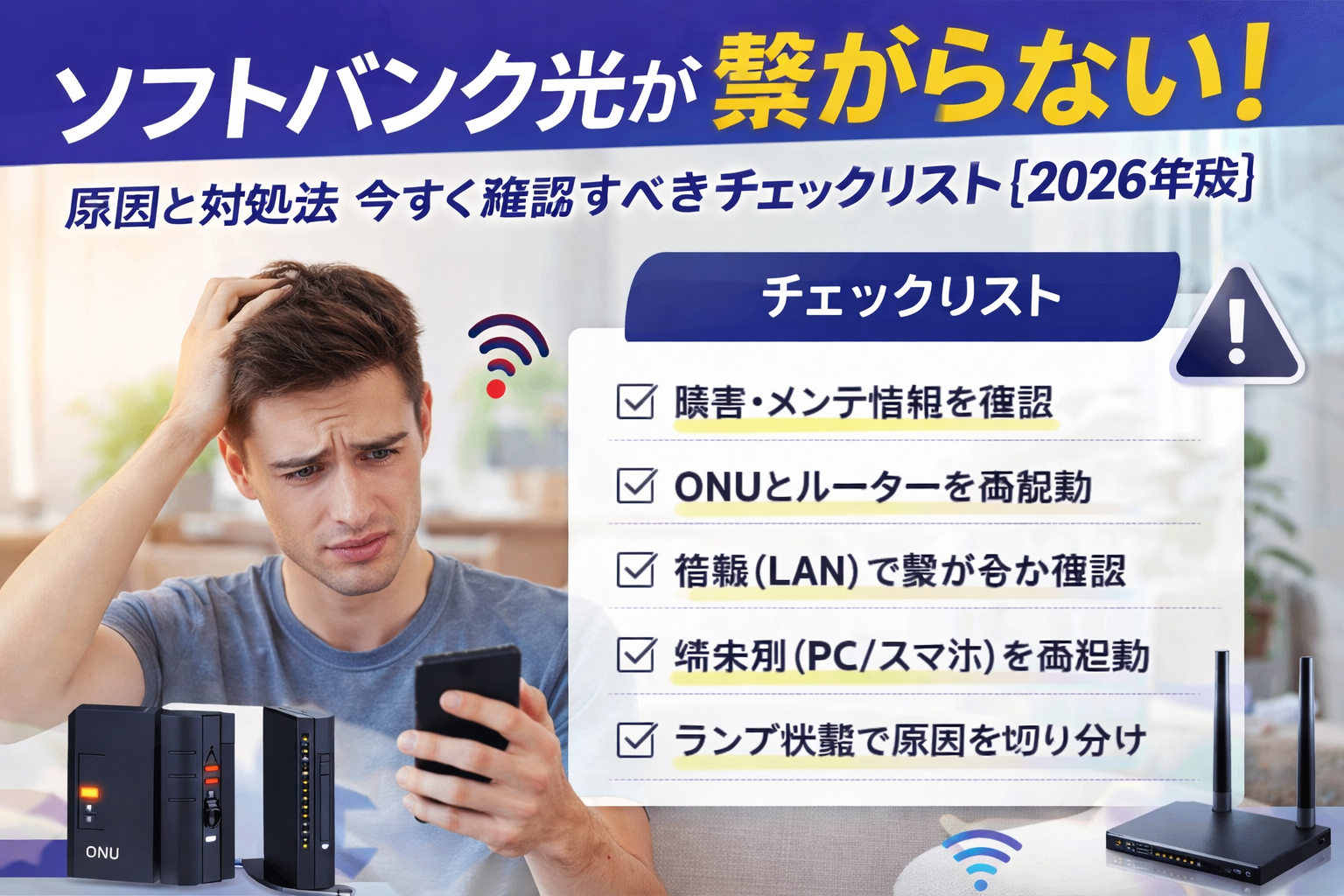 光回線 × 引越しソフトバンク光が繋がらない原因と対処法|今すぐ確認すべきチェックリスト【2026年版】 ソフトバンク光が繋がらない時は、障害→機器→配線→Wi-Fi→IPv6の順で切り分けるのが最短。復旧チェックリストで手順を整理しました。 2026.02.04 2026.02.06光回線 × 引越し光回線の基礎知識