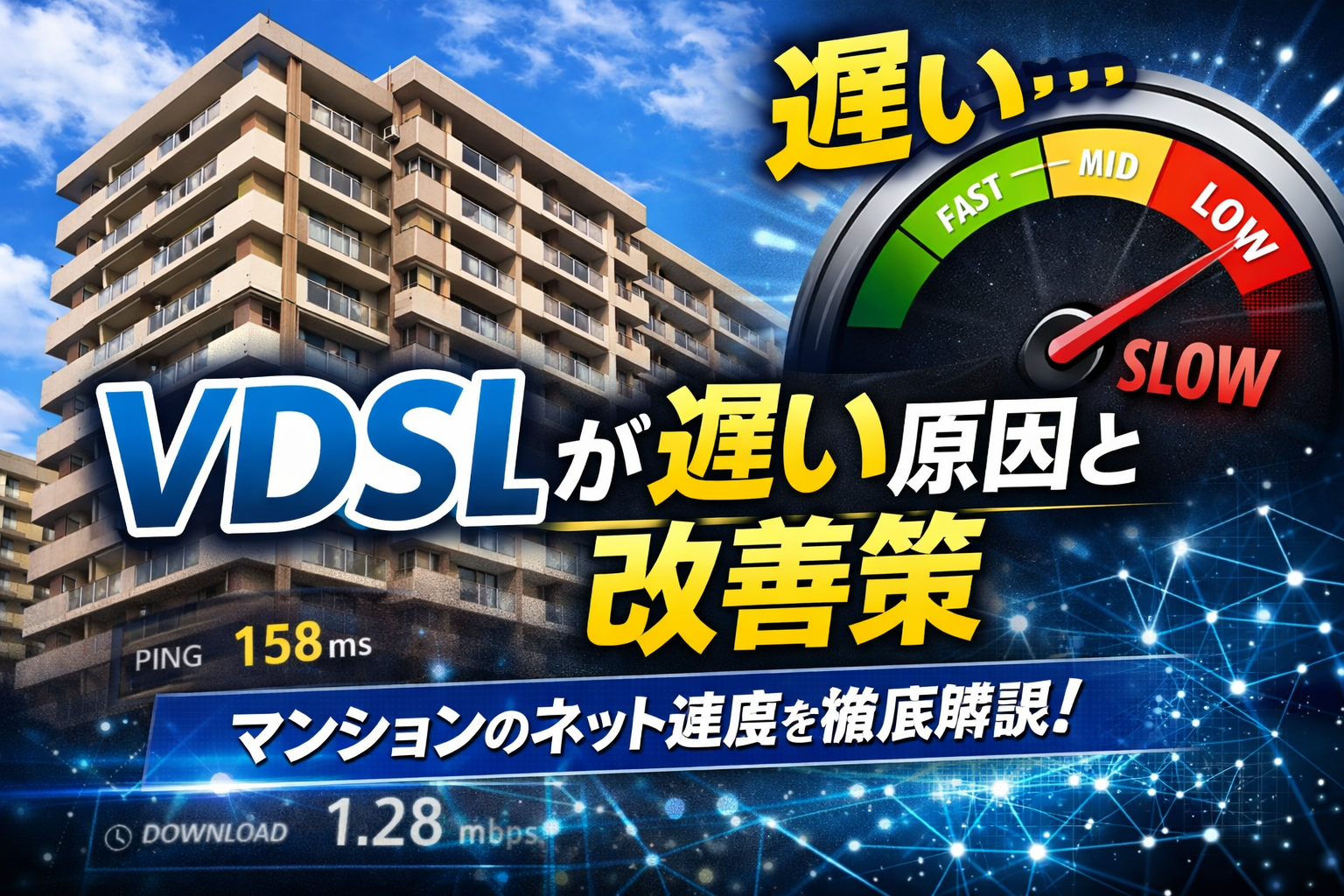インターネット回線・WiFiVDSLが遅い原因は回線じゃない?マンションで速度が出ない本当の理由と改善策【2026年版】 マンションのVDSL回線が遅い本当の原因を解説。夜だけ遅い理由、配線方式の違い、設定で改善できるケースと光回線へ切り替える判断基準まで、2026年最新版でまとめました。 2026.02.07 2026.02.10インターネット回線・WiFi光回線の基礎知識