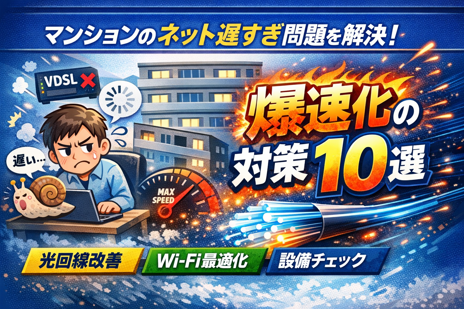 インターネット回線・WiFiマンションのインターネットが遅い原因7選|夜だけ遅い理由と今すぐできる改善策【2026年版】 マンションのネットが遅い原因を7つに整理。夜だけ遅い理由、配線方式・混雑・Wi-Fiの切り分けと今すぐできる改善策を解説。 2026.02.08 2026.02.10インターネット回線・WiFi光回線の基礎知識