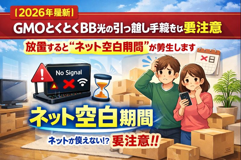 インターネット回線・WiFi【2026年最新】GMOとくとくBB光の引っ越し手続きは要注意|放置すると“ネット空白期間”が発生します GMOとくとくBB光の引っ越し(移転)手続きを手順で解説。工事が必要/不要の見分け方、申請のベストタイミング、よくある失敗と回避策まで整理し、ネット空白期間を防ぎます。 2026.01.16インターネット回線・WiFi光回線 × 引越し引越しの手続き